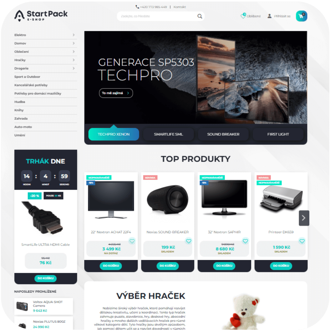 StartPack e-shop září moderním webdesignem a poskytuje 100% responzivní grafickou šablonu, která zajišťuje uživatelsky přívětivé prostředí během on-line nakupování. Bez ohledu na to, zda vaši zákazníci nakupují přes mobilní zařízení, tablet nebo počítač, budou mít k dispozici intuitivní a pohodlné prostředí.
